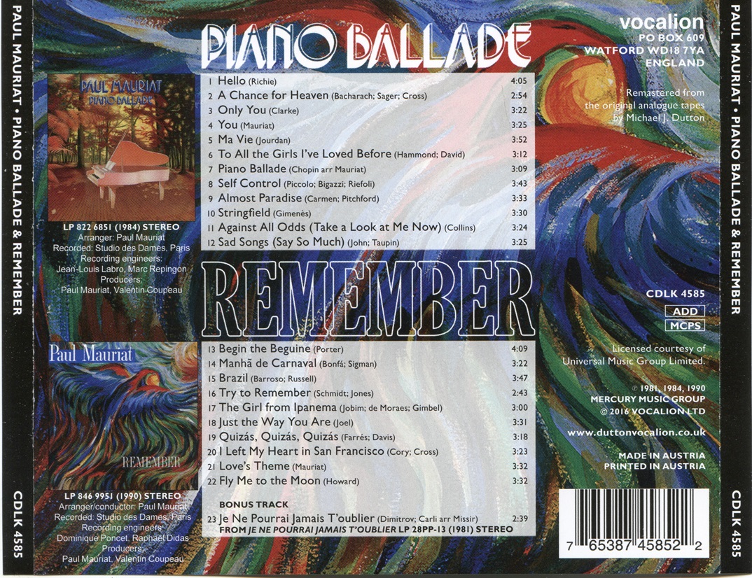 Paul Mauriat – 2016 – Piano Ballade Paul Mauriat – 1984 & Remember Paul Mauriat – 1990 [Vocalion CDLK 4585, Austria][FLAC+CUE]