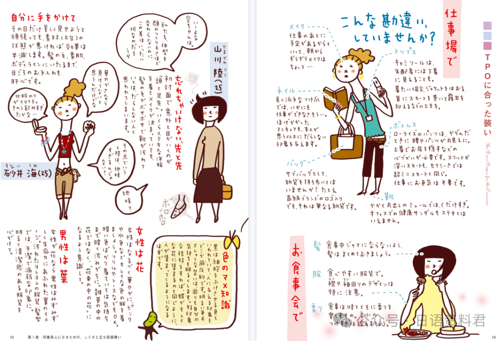 日本人常说的优美表达(美しい言葉);餐桌上的细节礼仪(きれいな食べ方・食べ方のマナー);四季节日怎么过(季節行事);送礼、回礼的讲究(贈り方のマナー);敬语怎么用才不失礼(敬語の使い方)等等······每一页都配有手绘插图、情景漫画、对比表格,即使是日语初学者,也能轻松掌握日本文化中那些重要的核心部分。